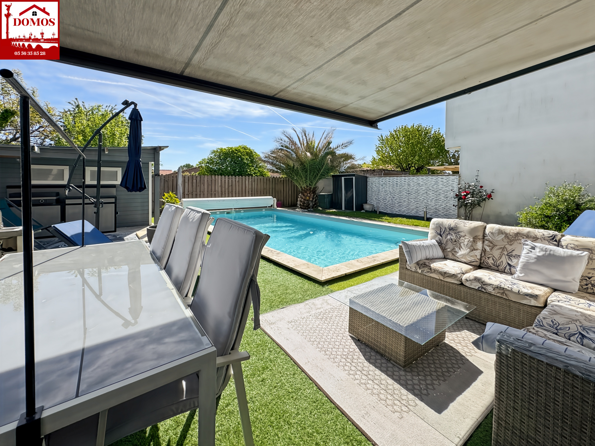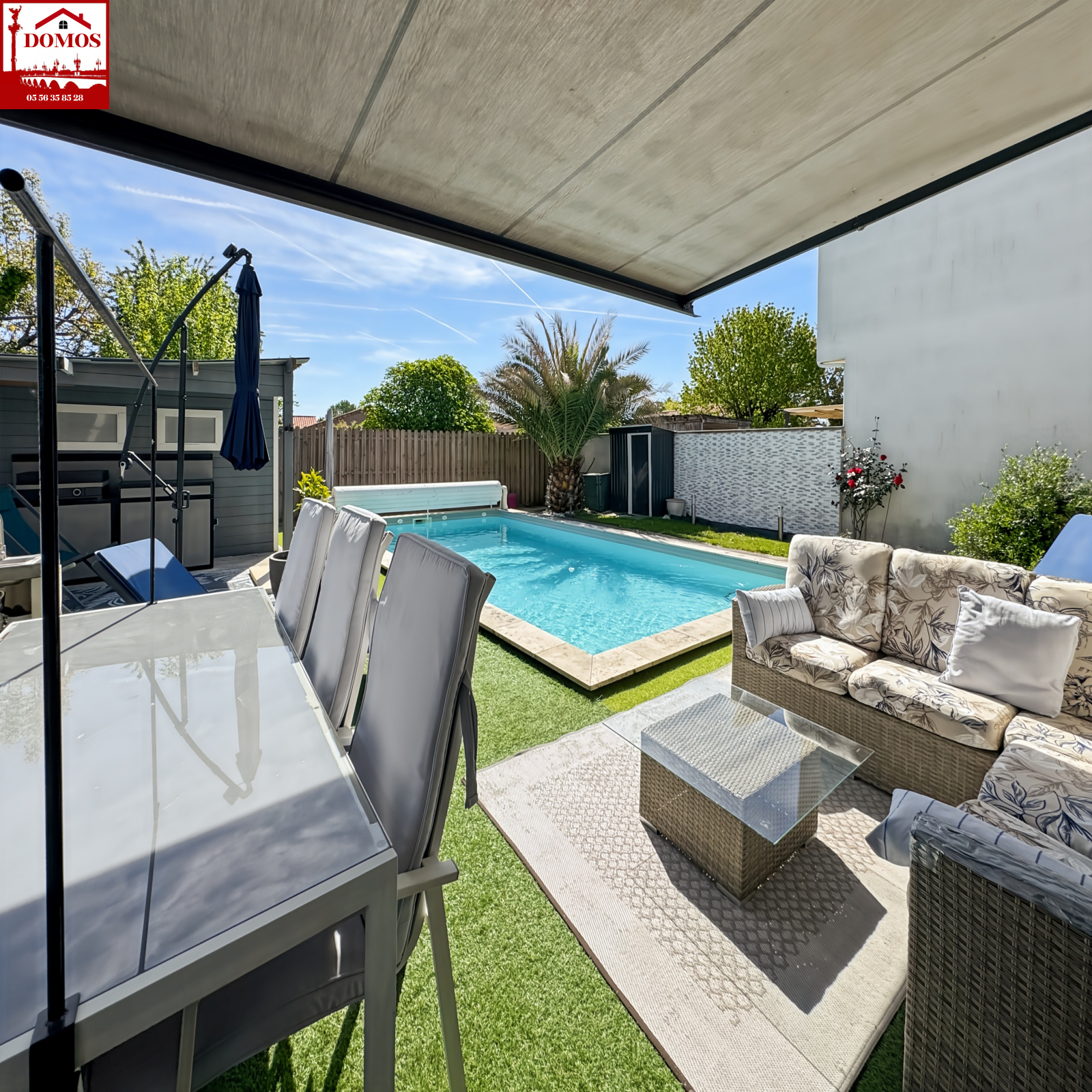 Beau jardin avec piscine chauffée et équipée d’une bâche électrique.